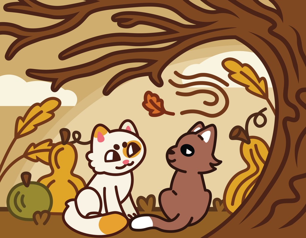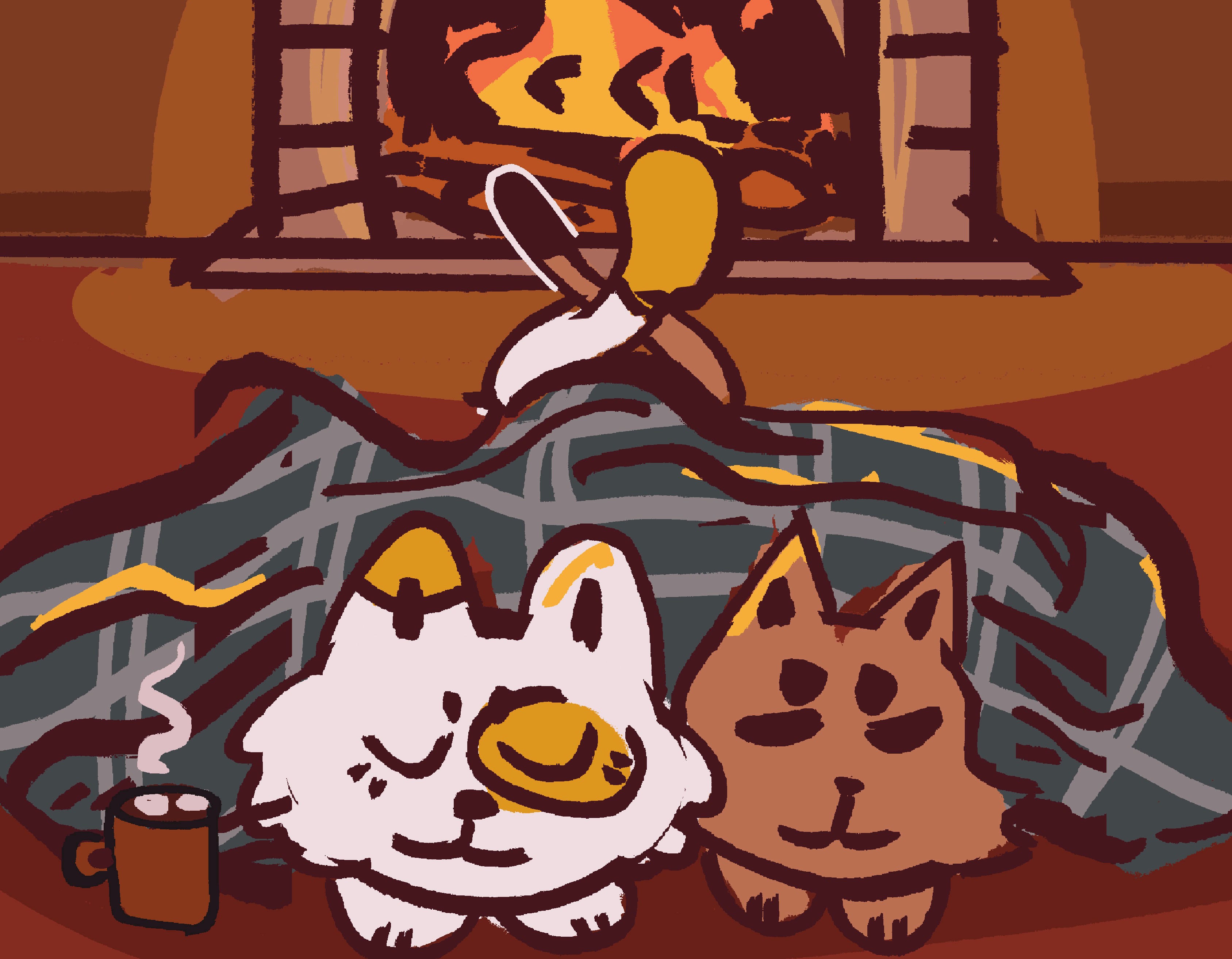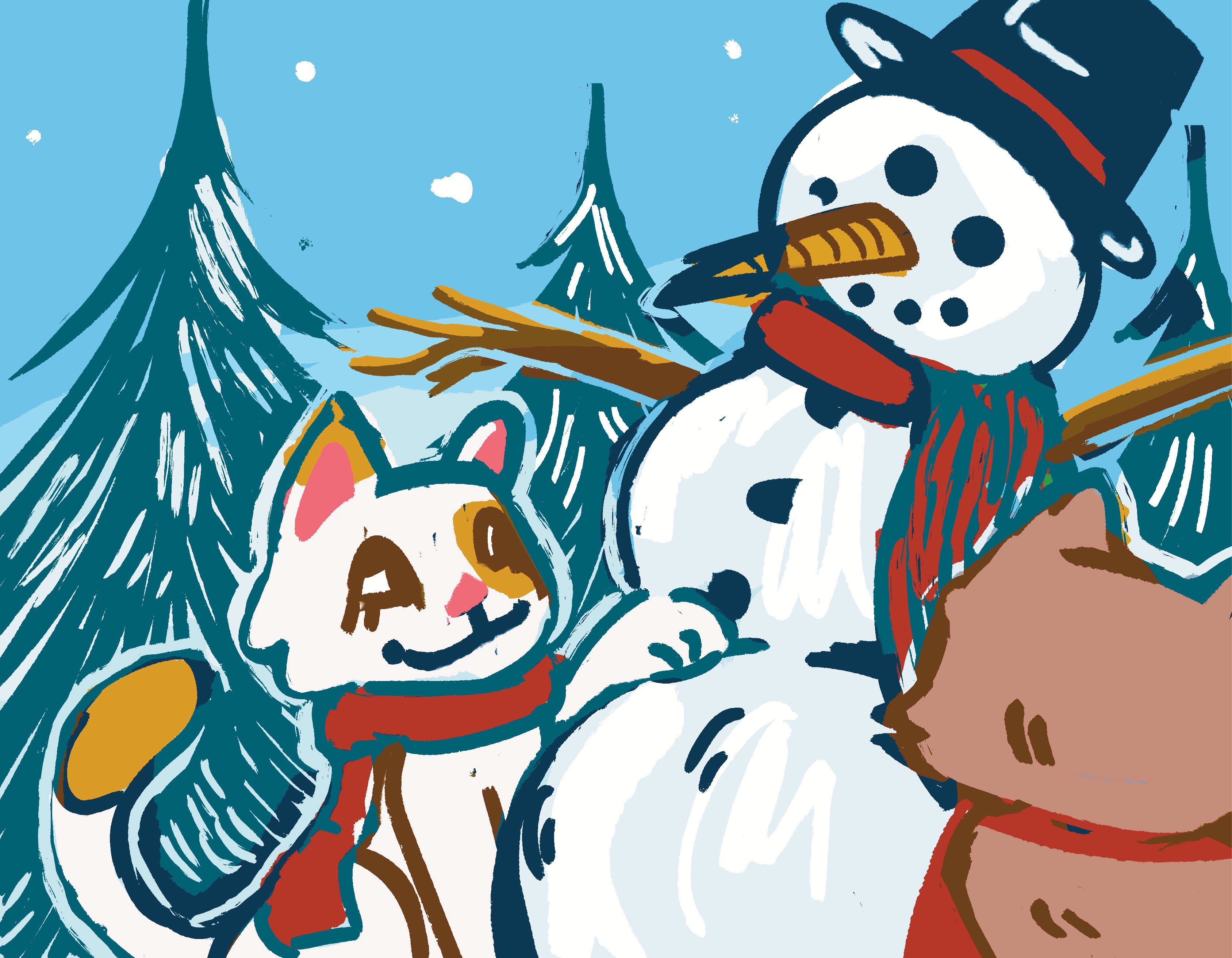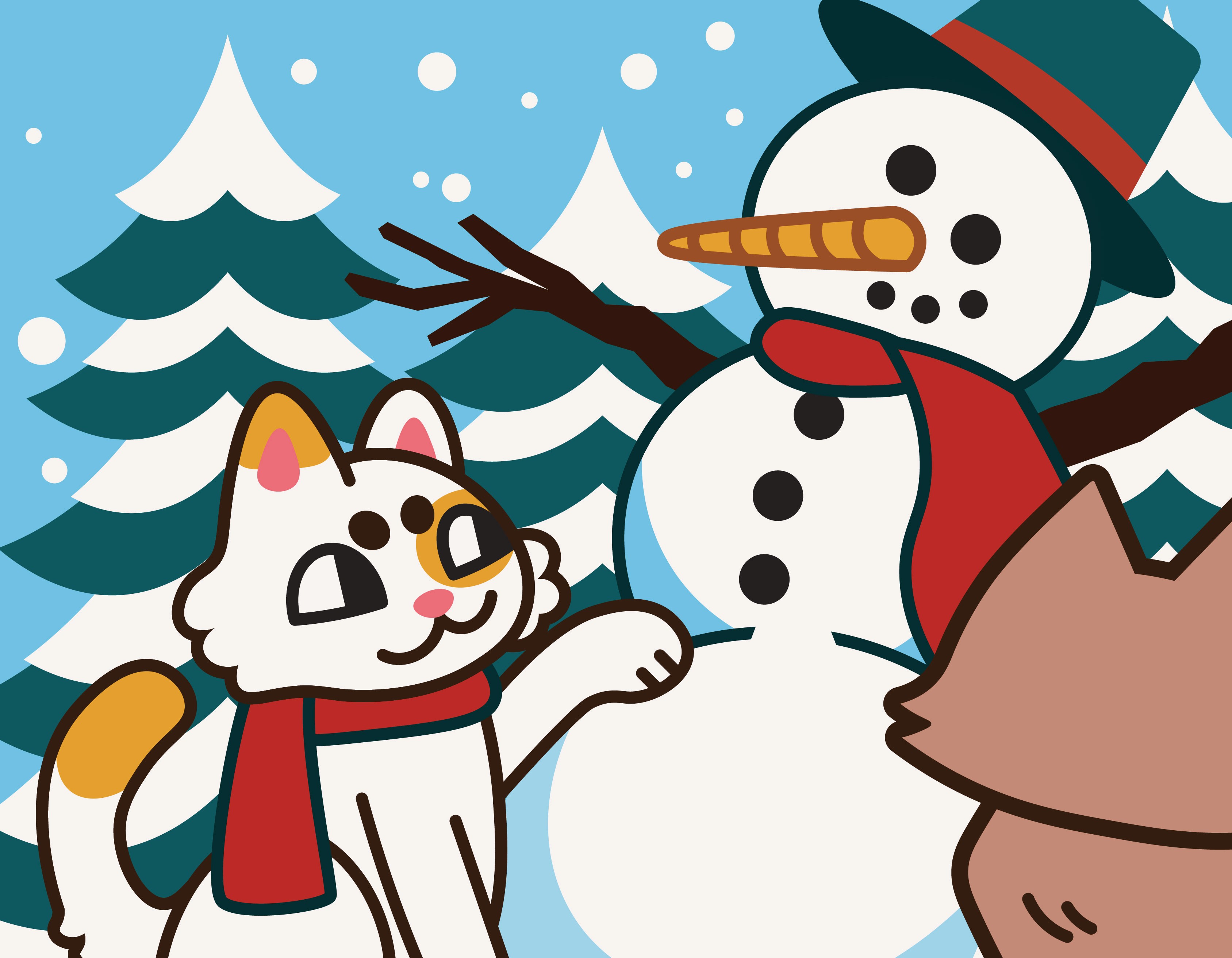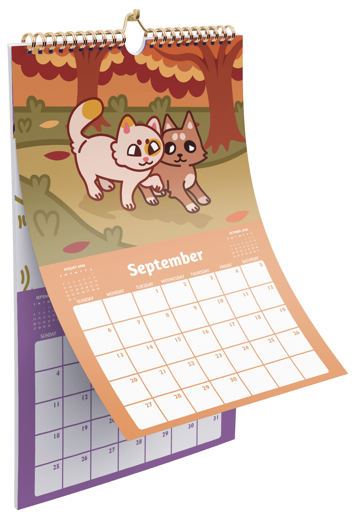 A 12-month calendar full of colorful illustrations of “slice of life” moments between two cats throughout the year. Each illustration connects to the weather, holiday, or just general connotations of the month. Geared towards young and young-at-heart cat fans who like colorful art. Created in Adobe Illustrator with vectors and a heavy focus on shape and color.