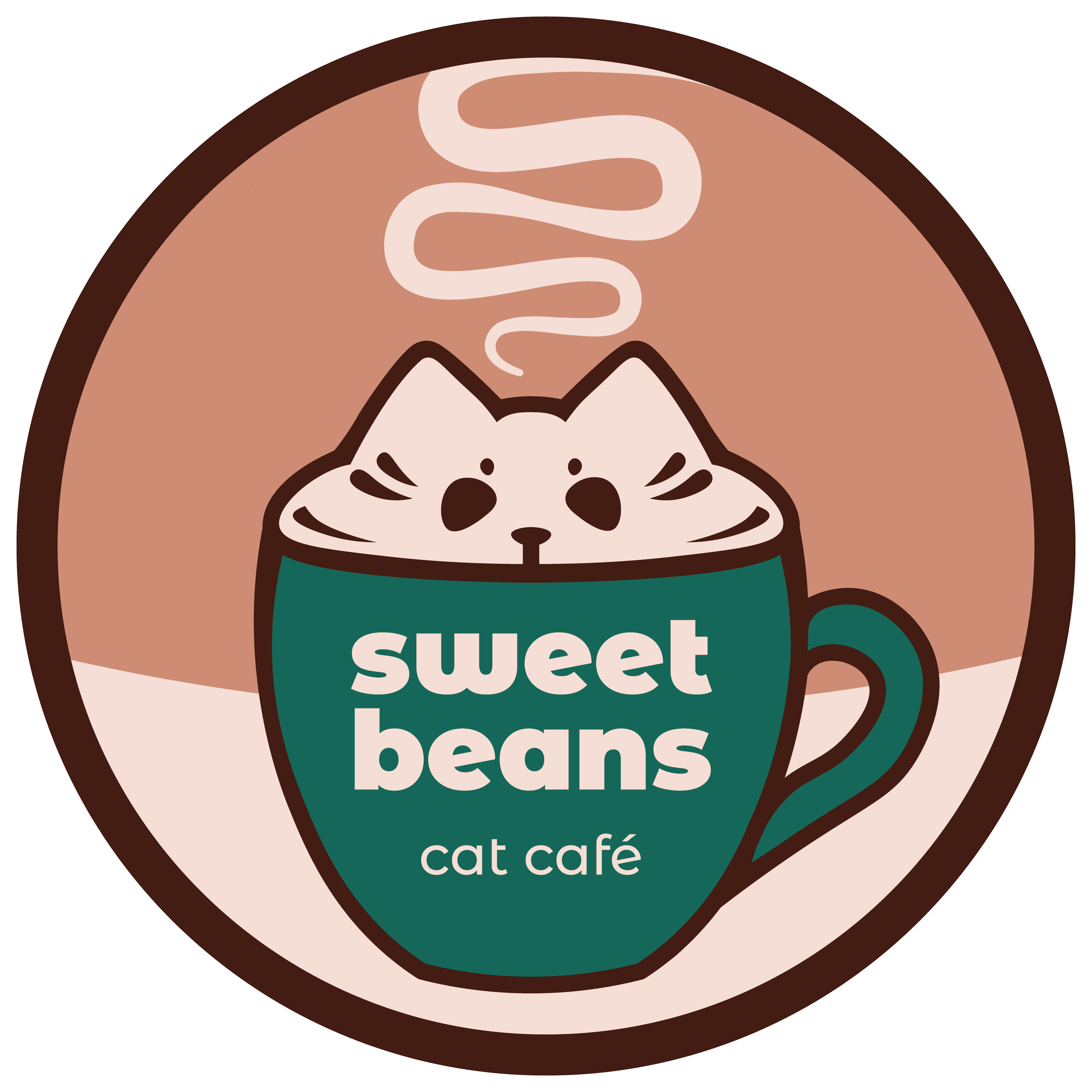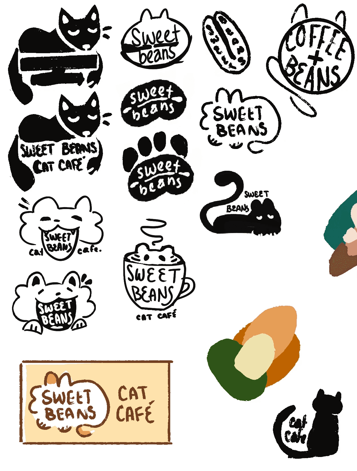 As always, I began with sketches. After choosing the name of the café, Sweet Beans - referencing both espresso beans and a cat paw's "toe beans" - I began brainstorming for a logo. I knew I wanted the logo to, of course, be clean and professional; however, it was also very important that it be cute. I knew from the beginning that I wanted to have stickers as part of the project, and I wanted to make sure my logo, as a sticker, was something that people would be attracted to and want to take and use. Of course, I knew I needed to incorporate a cat in some way, but I wanted the design to be obviously coffee-themed, too.