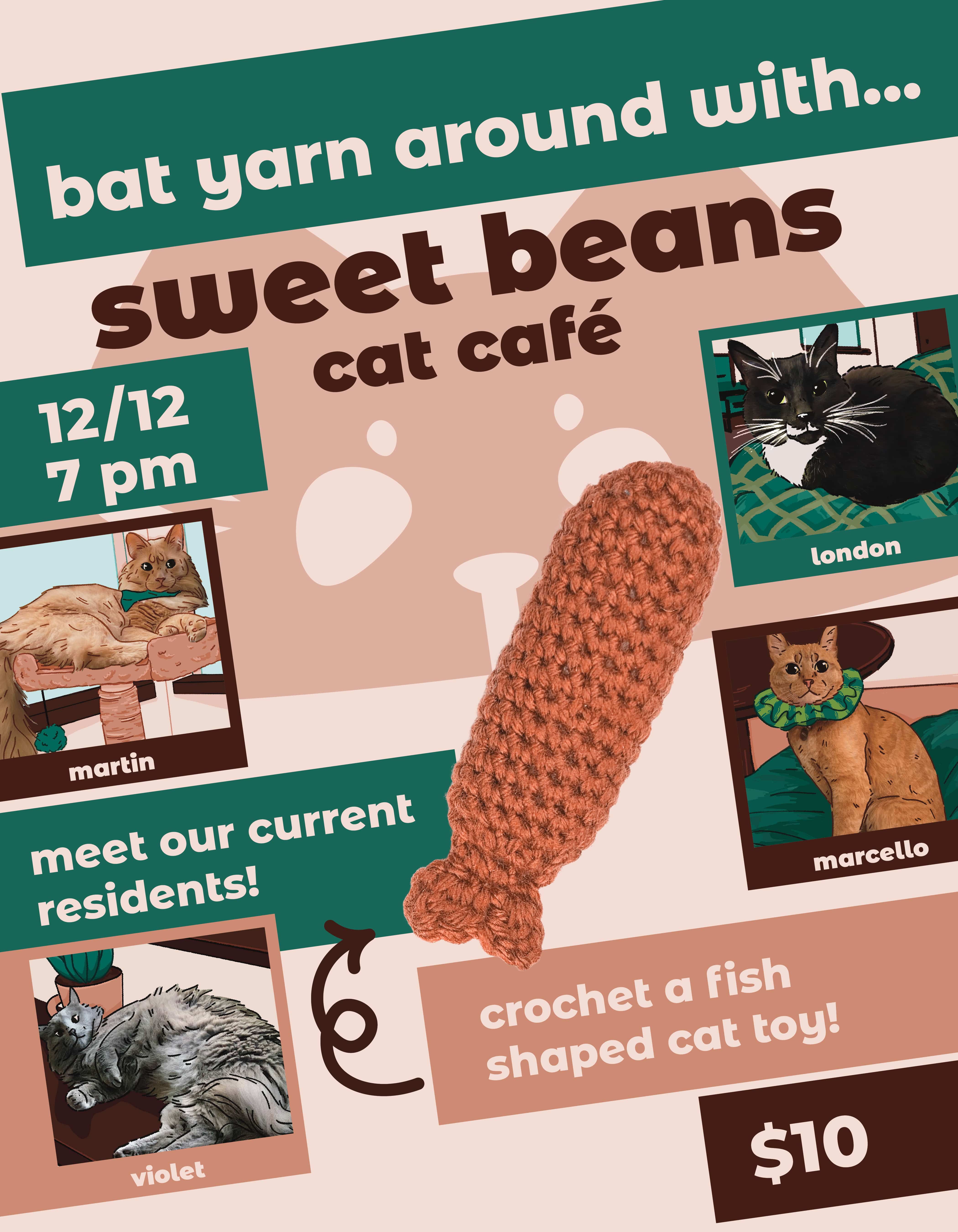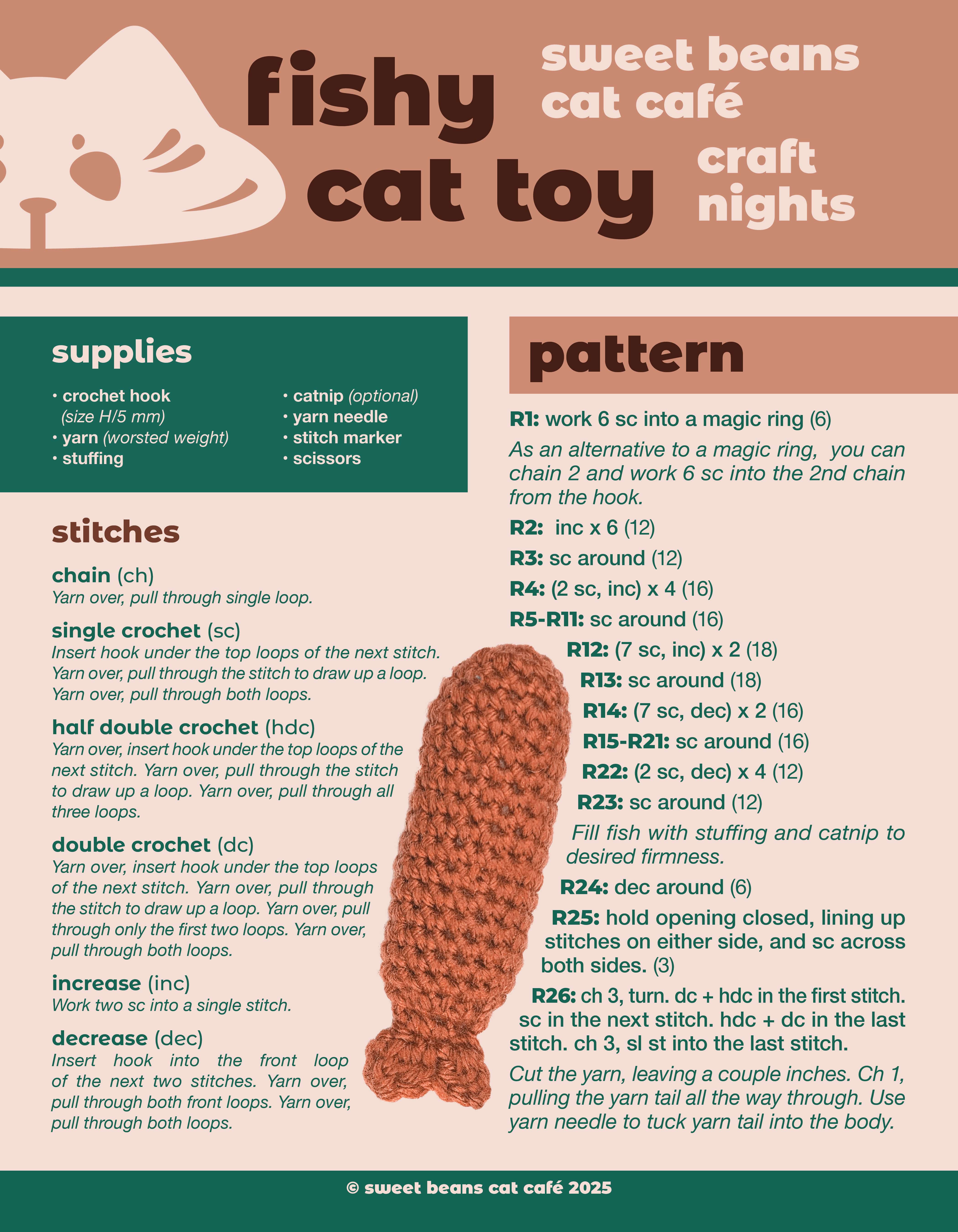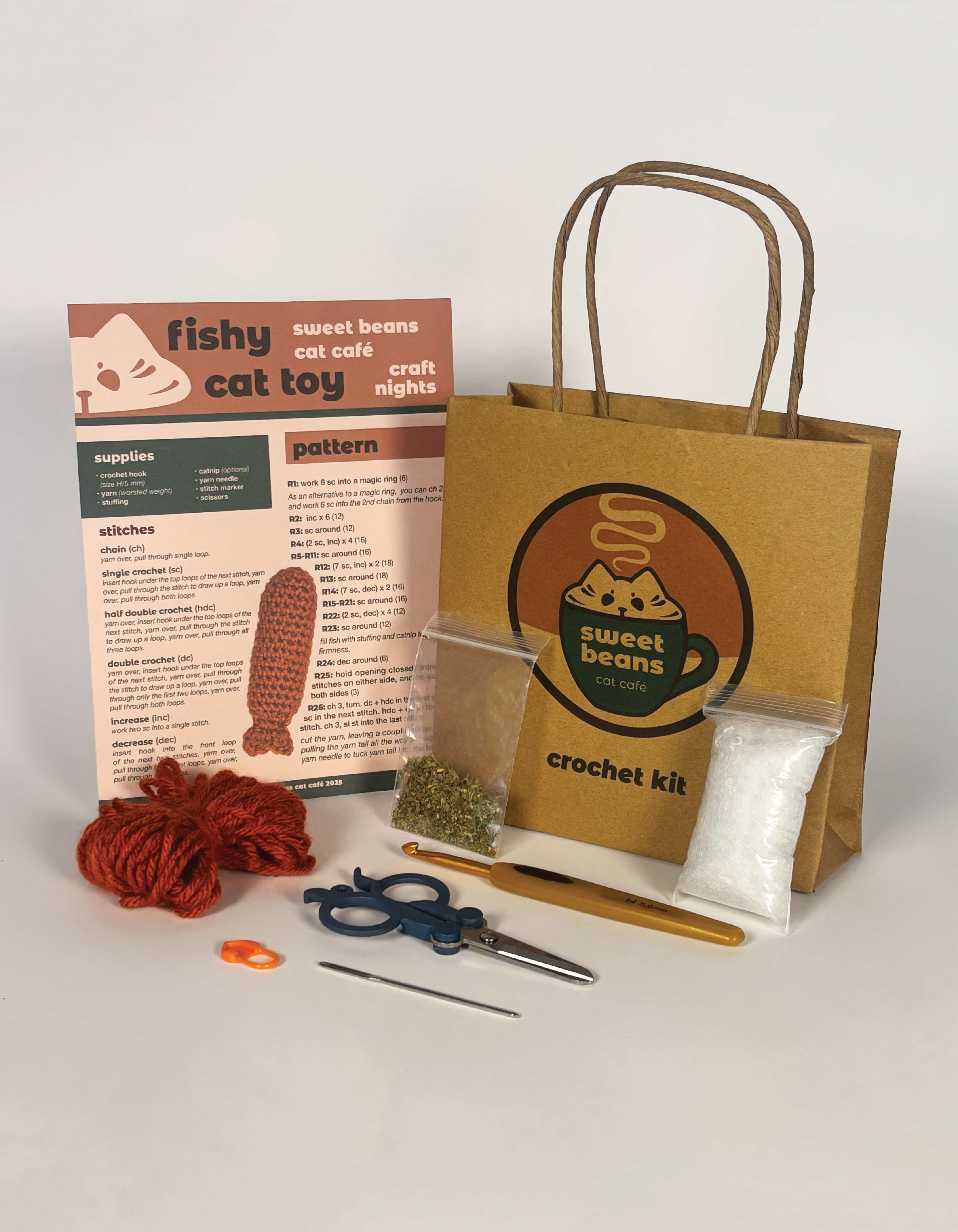 As mentioned earlier, I had the idea to have a promotional event at the café, a craft night, in which people could come in and make their own crochet cat toy. As a crocheter myself, I set out to create a pattern that was as easy to read and beginner-friendly as possible, fully utilizing the limited space. I also created the kit itself, including the pattern, yarn, a stitch marker, a crochet hook, sewing scissors, a needle, stuffing, and catnip, all placed inside a branded paper bag I designed and assembled.