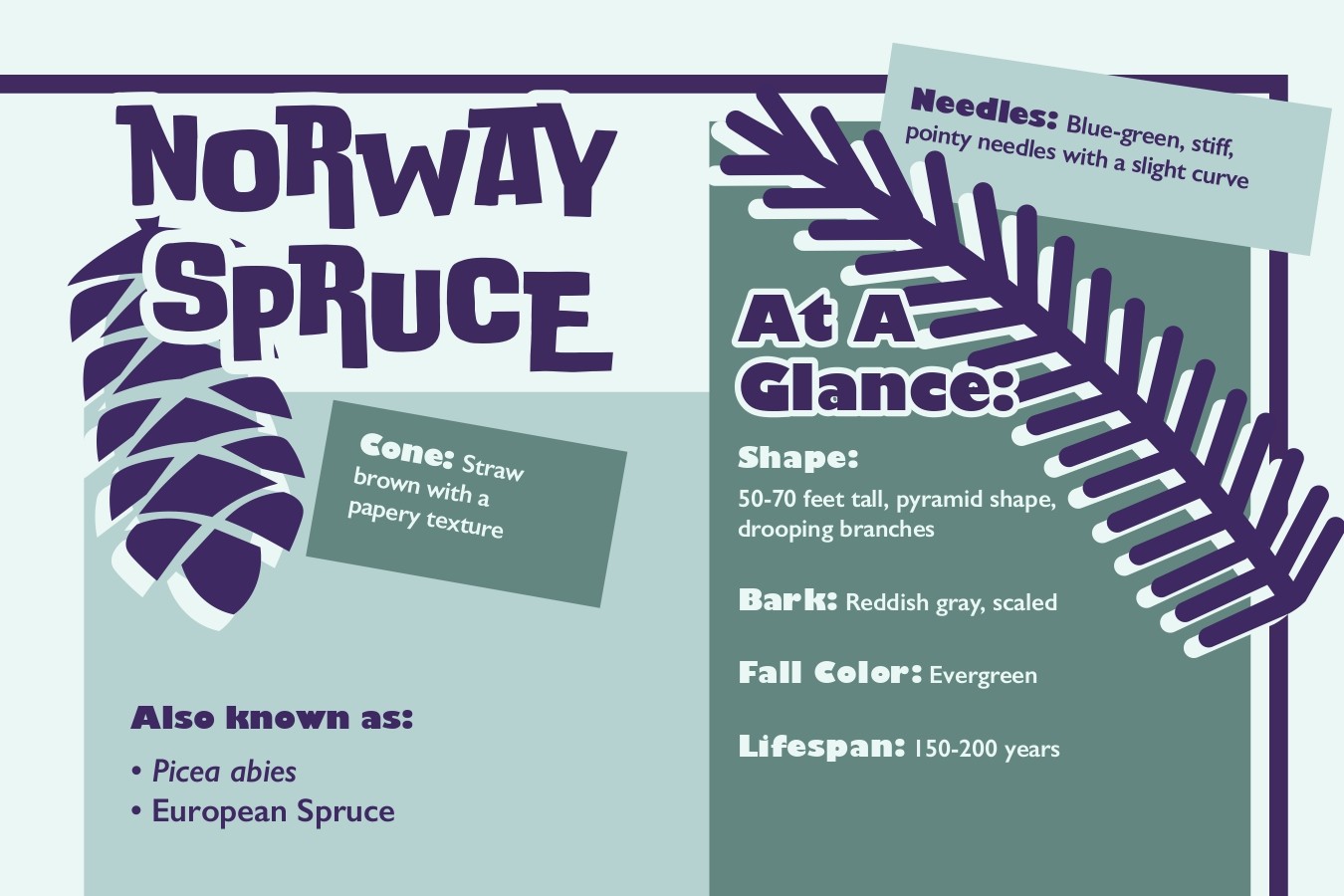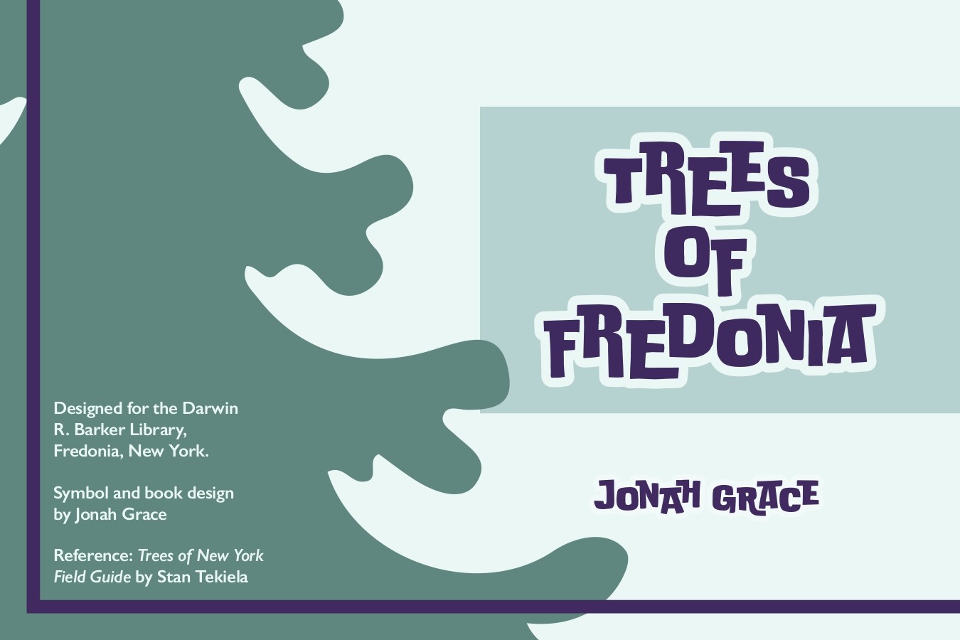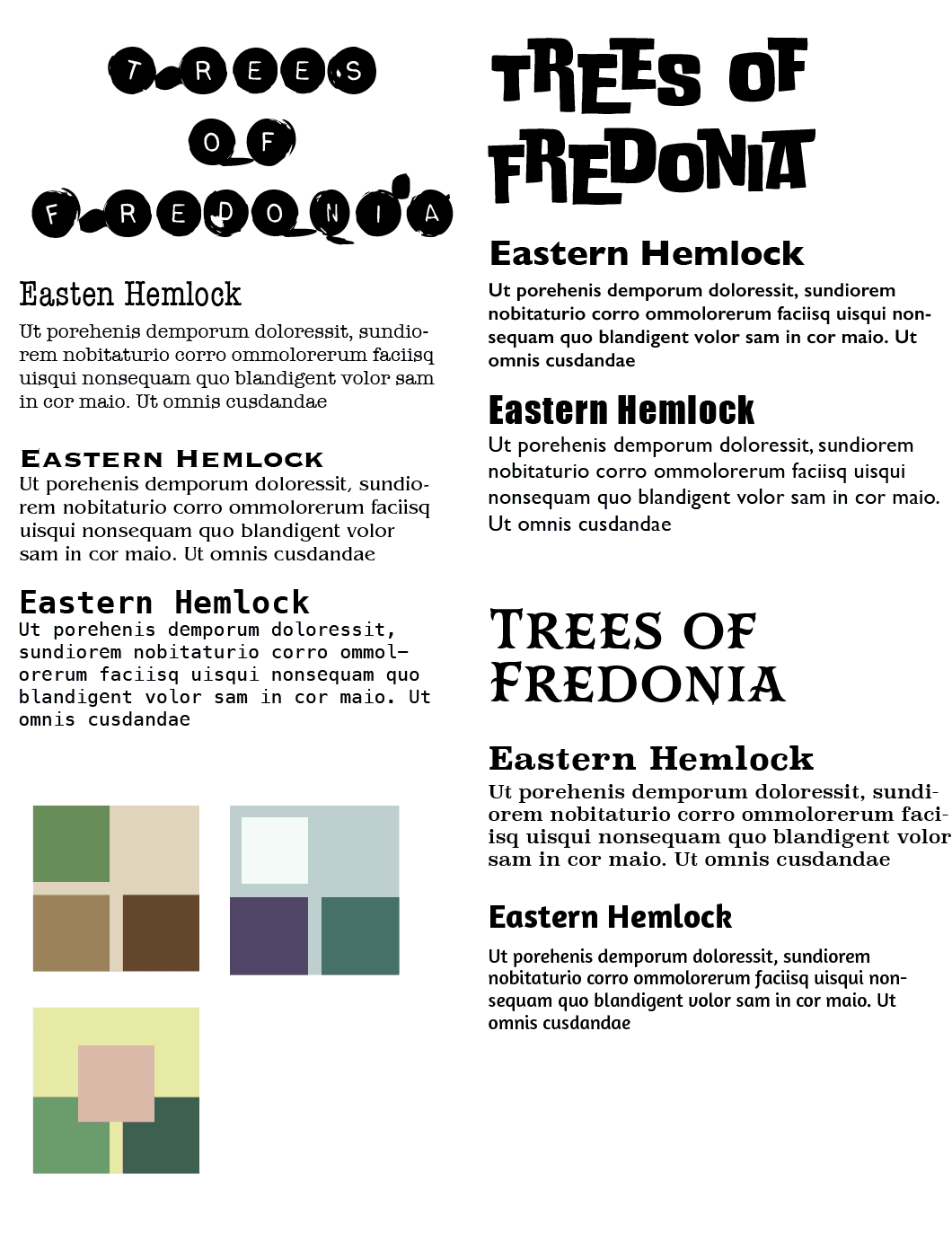 An informational booklet featuring 12 of the common trees found in the Fredonia, New York area. Includes identifying information, trivia, and designed vector icons of leaves and fruit/berries of the tree. A funky, unconventional design aimed at an audience of SUNY Fredonia college students in an effort to create engagement with the natural world around them.